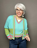 Als Kontrast: 100 (100) 200 (200) 200 (200) 200 (200) 200 (200) g Patagonia Fb. 140 (Granny Smith), und für alle Größen 100 g Patagonia Fb. 142 (Bubblegum), zusammen mit 50 (75) 75 (75) 75 (100) 100 (100) 125 (125) g Kidsilk Haze von Rowan, 70 % Mohair, 30 % Seide, LL 25 g/210 m in Fb. 722 (Türkis), 50 (50) 50 (50) 50 (50) 100 (100) 125 (125) g Kidsilk Haze Fb. 720 (Apfelgrün), 25 (25) 25 (25) 25 (50) 50 (50) 50 (50) g Kidsilk Haze Fb. 712 (Neonpink).