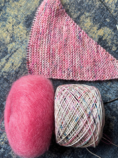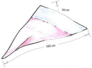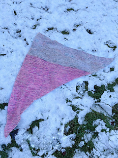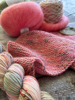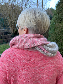 Die Optik des Mustertuches entsteht durch Verwendung zweier unterschiedlicher Farben in gleicher Menge. Es kann jede Wolle in Sport oder DK Stärke, sowie eine Kombination von Fingering und Beilaufgarn verwendet werden. Das Tuch eignet sich hervorragend dazu, Wollreste zu verwerten.