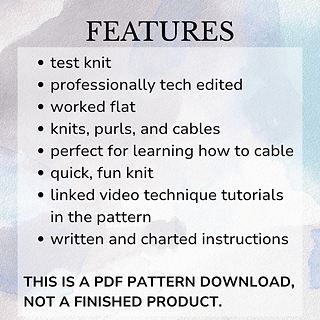 This pattern uses knit, purl, cable stitches. It is a great pattern for a beginner knitter who is excited to learn how to cable. The pattern is worked flat. You can choose to cast on and bind off as normal and then seam your ends together, or you may choose to use a provisional cast on and bind off using the kitchener stitch.