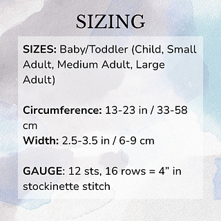 This is a fun, quick knit that creates a cozy, warm ear warmer headband. I love to wear mine in all types of chilly weather! They are perfect for spring and fall walks, and even for the winter when you don’t want to wear a hat! Your yarn type will be the primary factor determining how warm your ear warmer will be. This pattern is available in sizes baby through large adult.