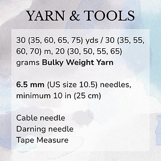 30 (35, 60, 65, 75) yds / 30 (35, 55, 60, 70) m, 20 (30, 50, 55, 65) grams Bulky Yarn