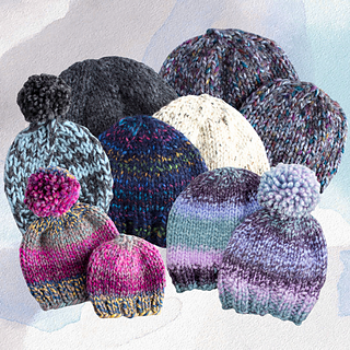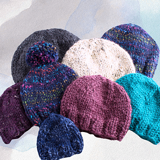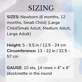I recommend knitting the size that provides 1-2 inches / 2.5-5 cm of negative ease in the circumference. This pattern includes sizes newborn to large adult and is easily adaptable for a sizing of your choice. If you wish for a beanie style, knit a height similar to the recipient’s measurement; for a slouchy style, add additional length prior to decreasing.
