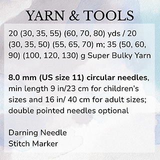 8.0 mm (US size 11) or size needed to obtain gauge circular needles, minimum length 9 in / 23 cm for children’s sizes and 16 in / 40 cm for adult sizes; double pointed needles optional