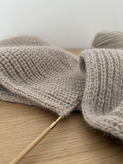 It is worked in one piece, starting at one scarf tip through the hood part and ending at the other scarf tip. The shaping is done with increases and decreases along one side, and a beautiful double knitted border finishes one side while an I-cord finishes the other.