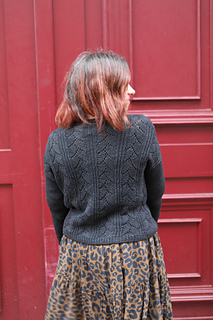 Mydas est donc un pull en top-down, avec un corps tout en dentelle et côtes. L’encolure et les épaules sont formées grâce à des rangs raccourcis, en aller-retour. Puis le corps se poursuit en rond. Les manches contrastent volontairement en jersey pour que le corps soit mis en valeur.