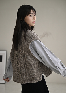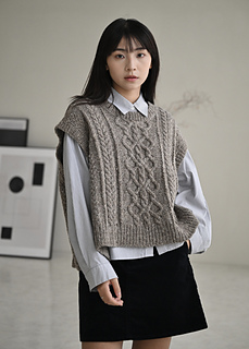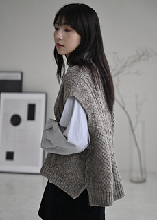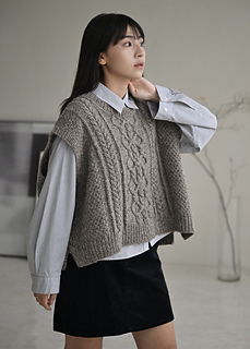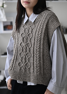 Myra vest is worked by knitting the back from top to the base of armholes. Both fronts are picked up and knitted separately, working from top to the base of front neck edges. After joining both pieces, front is worked to the armhole. Then back and front are joined and knitted in the round to the hem. The pattern comes in two different neck style options: Turtleneck and crew neck.
