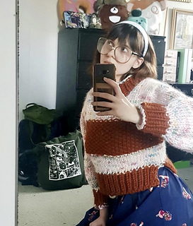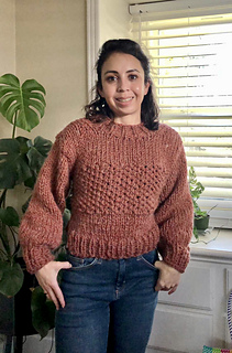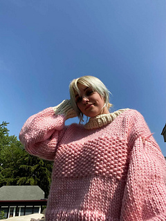 The jumper is knitted in four separate panels (front, back, and two sleeves) which are then seamed together, and a collar added at the end. It is a perfect knit for a confident beginner knitter!