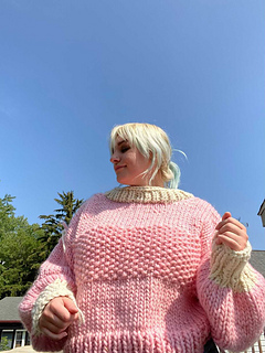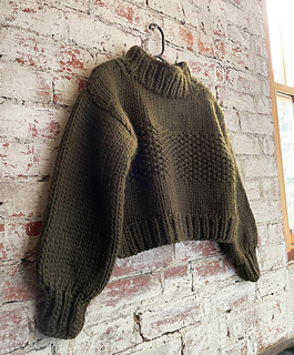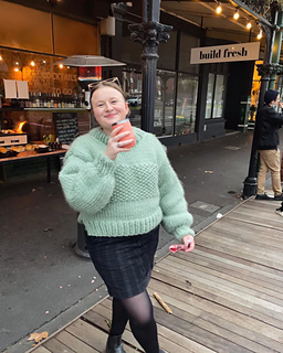 The Naarm Knit jumper is a beginner friendly and super cosy knitted jumper. She’s a chunky and cropped knit, with a high chunky collar to keep you snug, and with split sides for a flattering fit over high waisted pants or skirts.