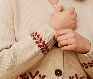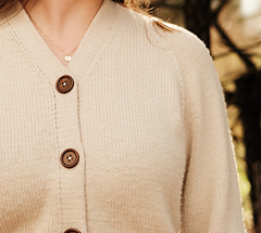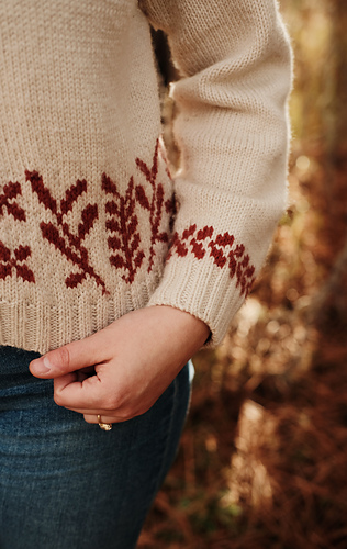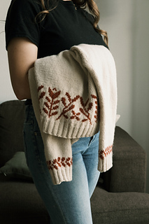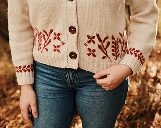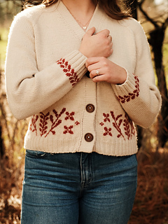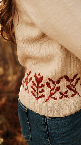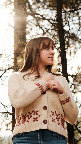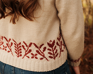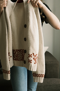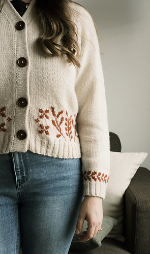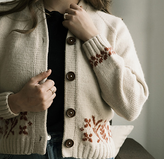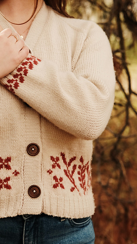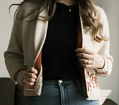 The Nadine cardigan is a top-down compound raglan cardigan with a floral colorwork motif around the bottom hem. A fun detail is a double knit button band that has the contrast color on the inside, creating a cohesive piece.