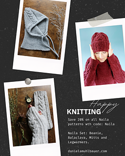 save 20% on all Naila patterns (Beanie, Mitts, Balaclava, Legwarmers) on my website danielamuhlbauer.com with code: Naila