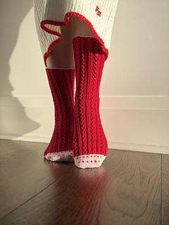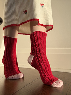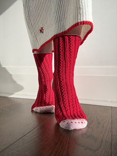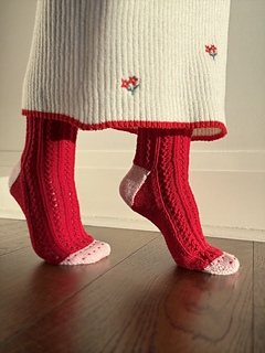 This lace and ribbed sock is inspired by my mum who loves all the cheesy holidays that involve roses and heart shaped boxes of chocolates, she’s a romantic at heart and her favourite colours are red and pink so it seemed fitting to work the sample socks up in these sweet colours. A classic cuff down pattern, featuring a contrast coloured cuff, heel, and toe. The heel features a classic flap and gusset construction and toe is closed by a Kitchener stitch finish. The toe has a simple colour work feature resembling tiny hearts twinkling on the toes.