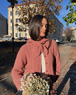 The first bow tip is worked from the tip up in moss stitch and shaped with increases. Then, stockinette stitch is worked and an opening is made for the second bow tip to be pulled through. In the extension of the opening, a double-knitted edge is worked along the bottom of the bonnet while stitches from the bonnet are binded off at the same time. The double-knitted edge flows directly into the second bow tip, which is first worked in double knit and then in moss stitch with decreases.