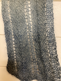 The fuzziness of the yarn along with the easy lace pattern allowed me to use a U.S. size 9 needle. The lace pattern is a very easy 2 row repeat. The project is quick, novice friendly, and appropriate for social knitting, yet is gift worthy to the most discriminating loved one!
