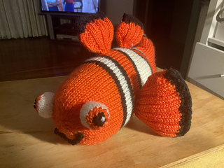 Nemo is knitted flat, the body has one seam along the bottom, the fins are two knitted pieces seamed together to give a feeling of quality to the finished item.