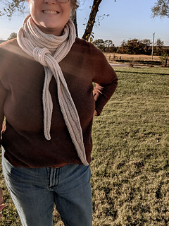 The pattern is designed to wrap around the neck and tie in front for a cozy, oversized warmth.