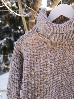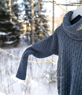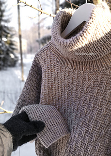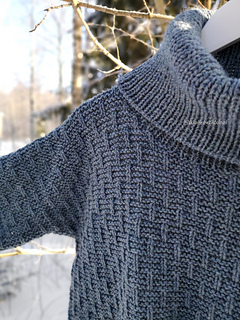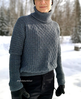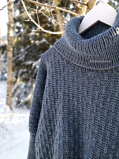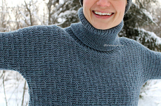 The sweater is worked from the top down, starting with the front and back, each worked flat. Then after separating the batwing sleeves, the body is worked in the round. Long ribbed cuffs are worked for the sleeves, a ribbed hem for the body, and a loose turtleneck collar is knitted for the neckline and then folded over. The surface pattern of the body consists of garter stitch and vertical lines created with knit stitches.