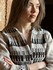 inspired style, with shape and set in sleeves and a high neck with a pattern that is a whole series of