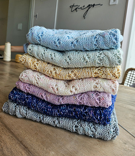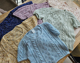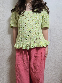 Since the design features lace knitting with eyelets, the final fabric and yardage can vary significantly depending on your yarn choice, needle size, body/sleeve length, and whether or not you add the frill.