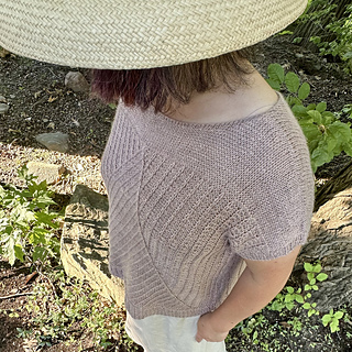 New Terrain is knit from the top down, starting at the shoulders with short rows shaping. The front and back are worked flat to the underarms, then joined and worked in the round to the hem. The neckline is left unfinished, allowing the stockinette stitch to roll naturally. The armholes are finished with 1x1 ribbing.