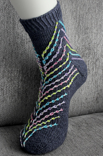 This is a fairly straightforward stranded sock with a few interesting details. Only two colours are used at a time; the contrasting vertical lines are added afterwards using surface crochet. The mosaic heel flap imitates the appearance of the stranded sole pattern.
