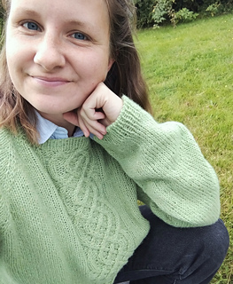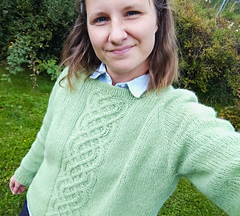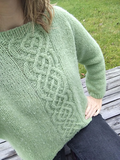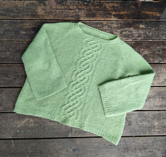 The sweater is knitted top-down on circular needles. It has a classic raglan construction and a decorative Celtic cable running vertically along the center front of the garment. The neckband is worked last, and all ribbed edges are finished with an Italian bind-off which gives a simple and elegant framing