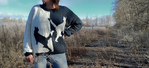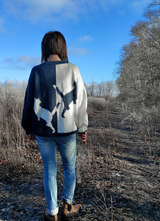 The sweater is worked in intarsia, continuing on both the front and back. The intarsia pattern on the back is worked as a mirror image of the front. The intarsia pattern is provided in multiple sizes, with a separate chart for each size.