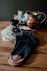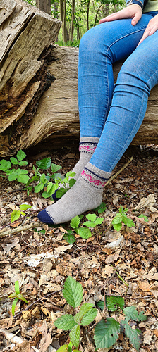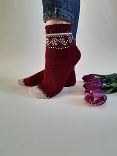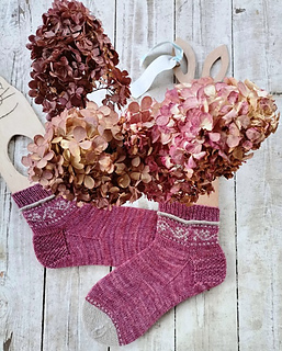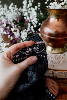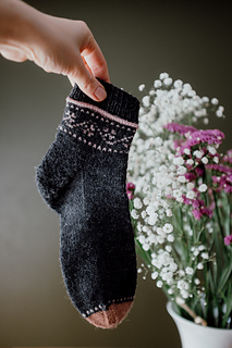 Night meadow socks are simple top-down socks with a decorative pintuck and a small fair-isle motif on the ankle. The heel is constructed using the heel flap and gusset method (the heel flap is reinforced with the Eye of Partridge pattern). There is also a little decorative feature on the toes.