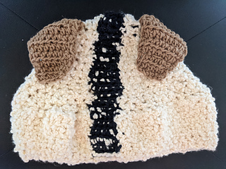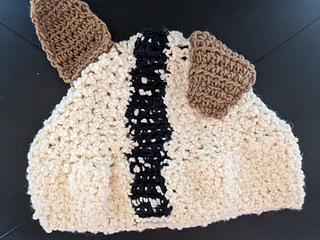 A hat inspired by the Penn State University football helmet and nittany lion ears. The pattern is one size and uses three skeins of yarn in the colors white, navy, and tan (for the ears).