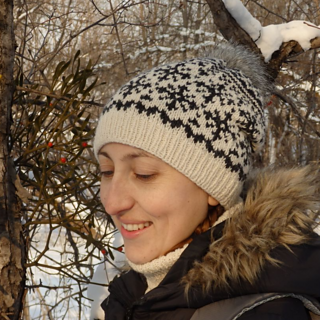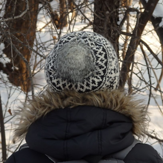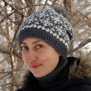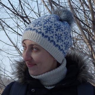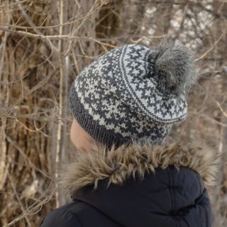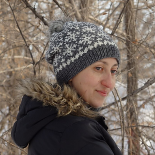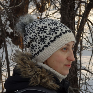 The body of the hat continues with snowflake inspired colorwork that can be done in dark color on a light background as shown in sample or can be reversed to get very different effect. Any two colors may be used depending on knitter’s preference.
