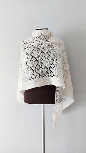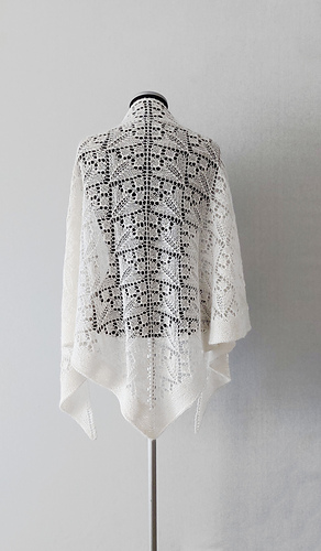 Shawl is classic top-down shawl, wich is worked in one piece and consists of two identical triangles, with a single spine stitch running down the center. Lacy blooms growing within diamond motifs.