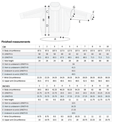 Body Circumference: 87.5 (97.5, 107.5, 117.5) (127.5, 137.5, 147.5) (157.5, 167.5, 177.5) cm / 34.5 (38.5, 42.25, 46.25) (50.25, 54.25, 58) (62, 66, 70)”.