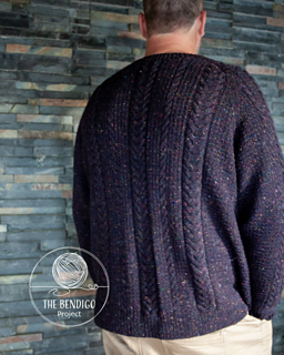 The hem, cuffs and neckline feature k1, p1 ribbing. The main body, sleeves and yoke feature a cable and broken rib pattern.