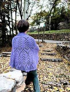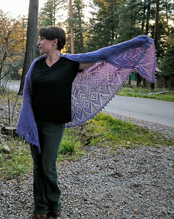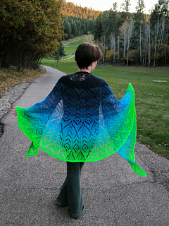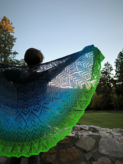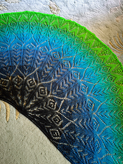 Nocturne is a semi-circular, all over lace shawl, available in two sizes (with 6 or 8 repeats at the top). Depending on the yarn used, it measures over 2m wide at the top, with 70-80cm drop. The larger option was designed to use one full skein of YarnArt Flowers (250g/1000m); the smaller option takes under 200g/800m of fingering-weight. The pattern has been modified slightly after knitting the larger prototype to accommodate for picot edging (I ran out of yarn too soon!). The second prototype exactly follows the pattern.