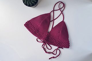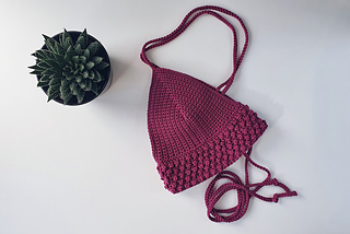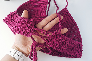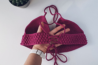 The straps are crossed at the back and they function as adjustable straps. Only one size is described in this tutorial, but the straps that cross at the back make these bikinis adjustable for a wide range of sizes, the minimal chest circumference is 60 cm.