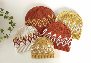 The pattern is worked bottom-up, starting with a ribbed brim, followed by a mosaic section worked in the round, and ending with crown decreases using extended half double crochet (ehdc) for a smooth, rounded shape.