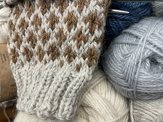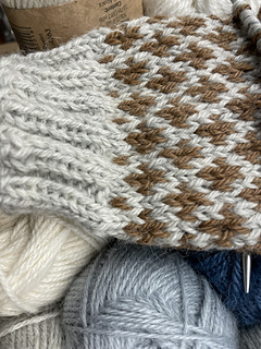 A two-color sock featuring a simple textured colorwork repeat. Worked in fingering weight and suitable for both women and men. The cuff is knitted with larger needles for a softer and more expressive edge. Easy stranded pattern, gentle floats, and a comfortable fit with a thumb gusset and short row heel.