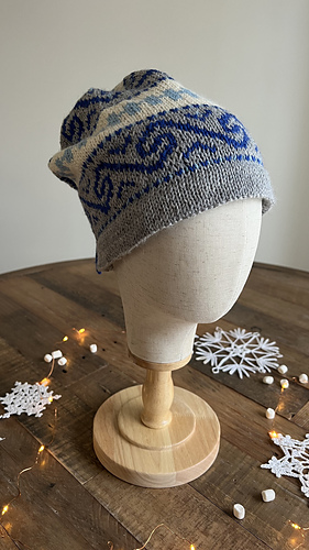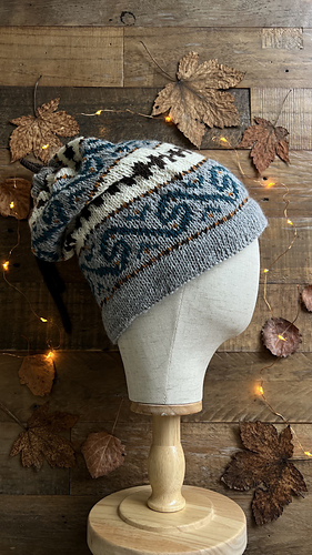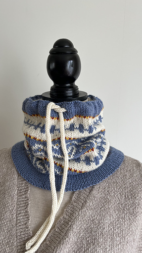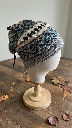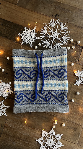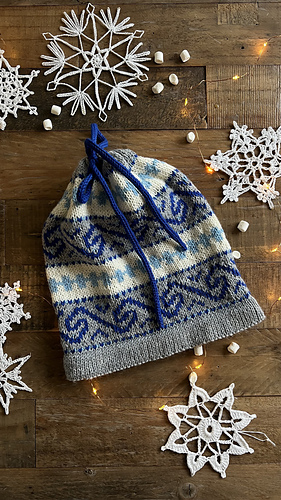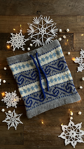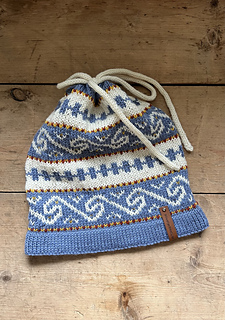Den strikkes rundt i glattstrikk på rundpinne nedenfra og opp, med brettekant nede og oppe, hull til snor, mønster etter diagram og strikket i-cord snor.