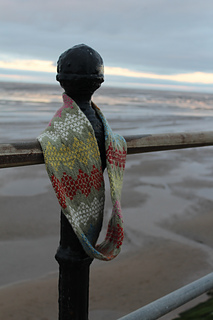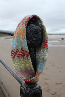 I designed this cowl in memory of my mum, Norma. The stranded design is based on the game of ‘dandelion clocks’ that me and my brother used to play with her when we were children. My mum was a ballet dancer and when I think of the seeds of the dandelion clocks dancing in the breeze, I think of her dancing and laughing. As we move through our lives we all leave traces. These traces continue to resonate after we have gone. I have therefore incorporated a twist into the design of the cowl to symbolise how we can experience time in a non-linear way.