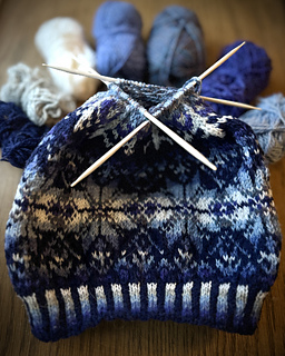 The beanie is a stranded knitting design, worked from the bottom up, using a maximum of two shades of yarn in each round. The sizing is for an average head size of 55 – 60cm. Depending on your personal sizing preference, the same pattern is knitted following needle recommendations for the snug fit or the roomy fit.