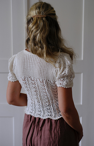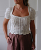The hallmark of this tee is its all-over openwork lace pattern, which creates a vertical, scalloped effect that is both elegant and flattering. With its square neckline and delicate puffed sleeves, it offers a sophisticated silhouette that pairs beautifully with high-waisted linen trousers or skirts.