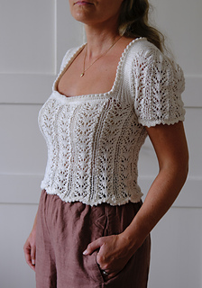 Nostalgia Tee is worked from bottom up starting with the body. Then the sleeves are worked and joined together for working the yoke. Finally, the neckline is finished with a beautiful picot detail.