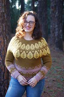 Shown in Boutique de Hilados Merino 3/5 - 19 Micrones (100% Merino Wool; 210 yds (192 m) / 100 g); 4 (4, 5, 5, 5) (6, 6, 6, 7) skeins in colorway ‘Dulce’ for MC; 1 (1, 2, 2, 2) (2, 2, 2, 2) skein(s) in colorway ‘Maiz’ for CC1; and 1 (2, 2, 2, 2) (2, 2, 3, 3) skein(s) in colorway ‘Rosa Viejo’ for CC2.