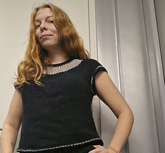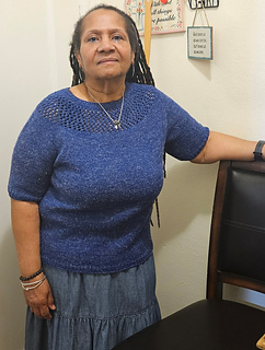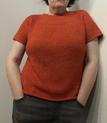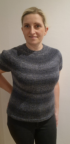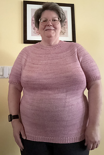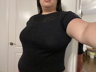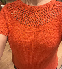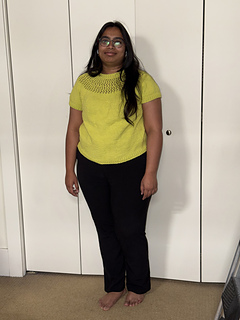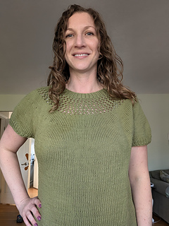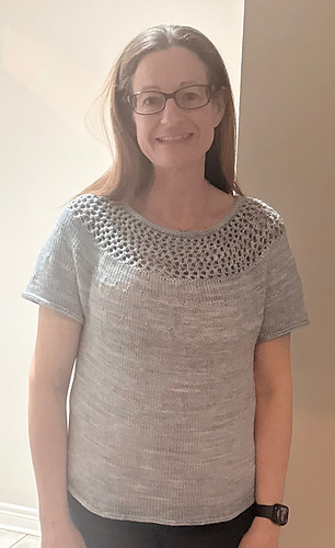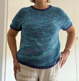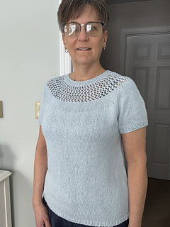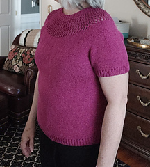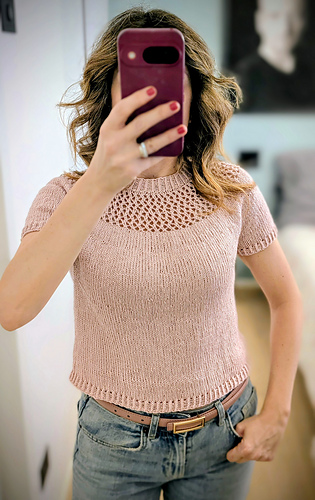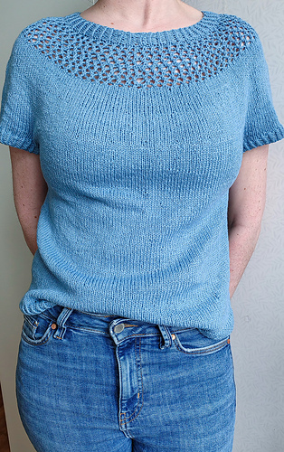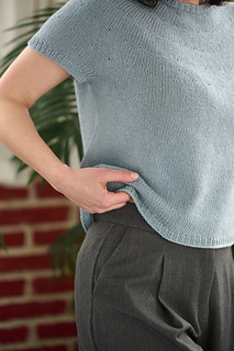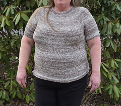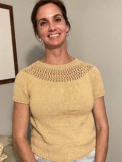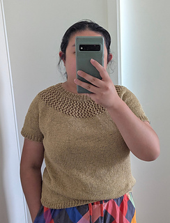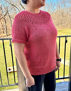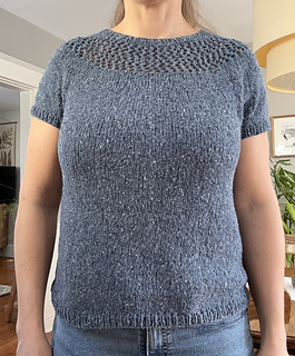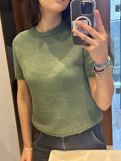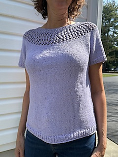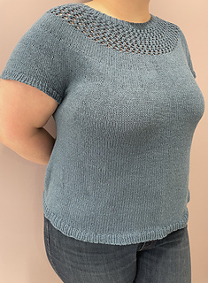 After the yoke is complete, the body and sleeves are separated. From there, the rest of the tee is worked in the round in stockinette stitch.
