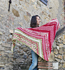 The knitting begins from the top corner. When the intended depth is achieved, the shawl end is shaped with German short rows. Squishy garter stitch stripes alternate with short lace sections, slipped stitch patterns and mosaic knitting. All the patterns use only 1 color per row. The shawl uses DK-weight yarn; it knits up rather quickly and will keep you warm without being too heavy. My sample uses 4 colors, but the pattern works as well with less colors, or more than 4 thus being a great stashbuster.