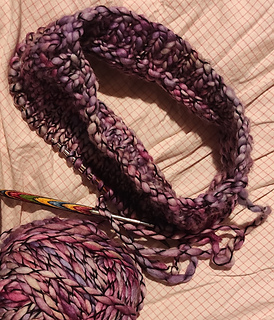 It‘s striking look is created by just a plain knitting from a bulky thick-and-thin yarn criss-crossed with a contrasting thread. Maybe, this is the right peace to knit from this art yarn you have in your stash?