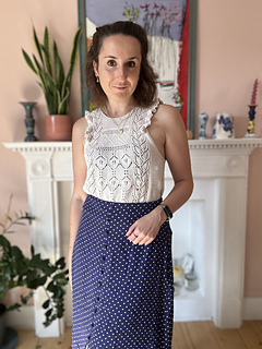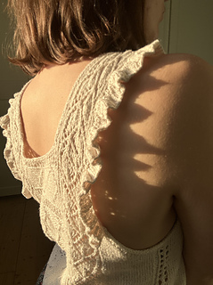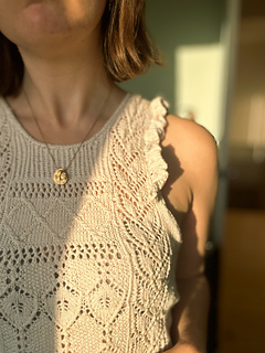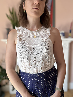The Occitanie Top is a light, romantic design inspired by Edwardian lingerie dresses, with their delicate lace and graceful ruffles. A minimal I-cord neckline adds a modern touch, while the ruffles ground the piece in timeless tradition.