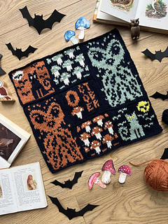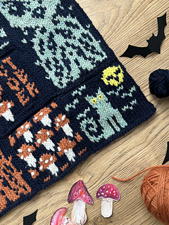 Embrace the chill in the air and stroll through woods, with leaves starting to crunch underfoot. Bats and owls dancing above, and vibrant mushrooms peeking from tree roots. The season of trick or treat - treat yourself to cosy knitting.