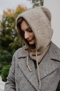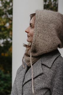 The hood is worked in the round and then flat, using stockinette stitch and 1×1 ribbing. A functional drawstring and neat kettel edging ensure a comfortable fit and a polished finish.