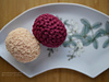 This amigurumi was inspired by ohagi (おはぎ), a traditional Japanese confection made of lightly pounded glutinous rice covered with chunky azuki bean paste. The kinako ohagi is a variation that uses soybean powder. Ohagi is traditionally offered during the autumn Ohigan (御彼岸), a week-long Japanese Buddhist holiday in which the Japanese pay respects to their ancestors.