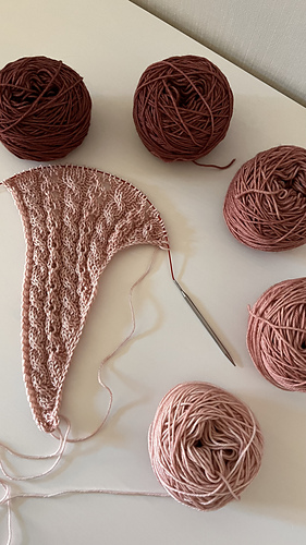 Dieser Schal besteht aus drei Teilen, Zunahmeteil, Mittelteil und Abnahmeteil.